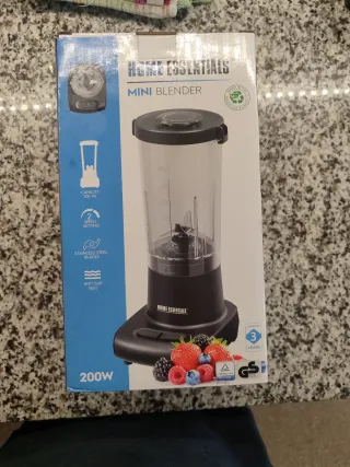 Mini batidora de la marca Home Essentials, perfecta para preparar tus batidos y smoothies. - Capacidad de 500 ml. - Dos ajustes de velocidad. - Cuchillas de acero inoxidable. - Pies antideslizantes para mayor estabilidad. - Potencia de 200W.