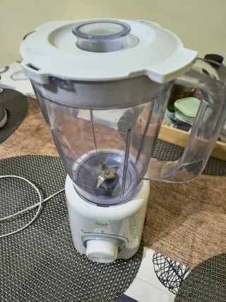 Batidora Moulinex en perfecto estado. Es una excelente opción para preparar batidos y otras recetas. • Potencia: aprox. 600–700 W. • Velocidades: varias velocidades + función pulse. • Capacidad jarra: 1,5 L aprox., plástico resistente. • Cuchillas: acero inoxidable, aptas para triturar hielo. • Limpieza: jarra y piezas desmontables y fáciles de lavar.