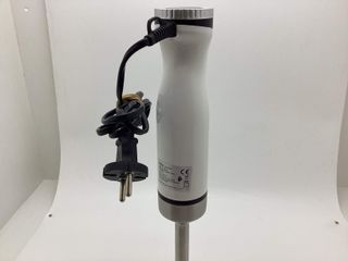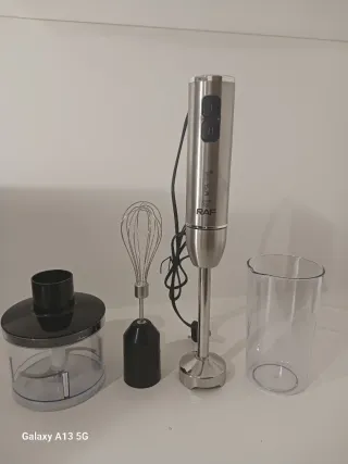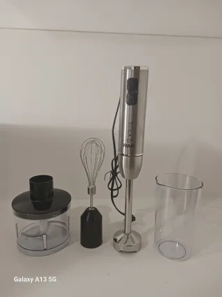 Práctica batidora de mano con varios accesorios para diferentes usos en la cocina. Funciona perfectamente pero los botones tienen desgastada la goma. Accesorios: - Cuerpo principal de la batidora en color blanco y gris. - Varillas para montar nata o claras. - Cuchilla para triturar. - Vaso medidor.