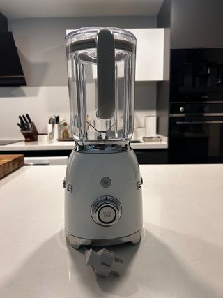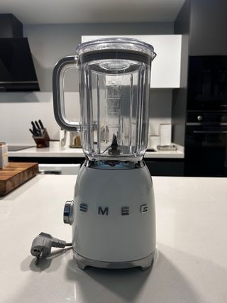 Batidora de sobremesa SMEG de color blanco. Diseño retro y elegante. - Jarra de plástico transparente. - Base cromada. - Controles de velocidad.