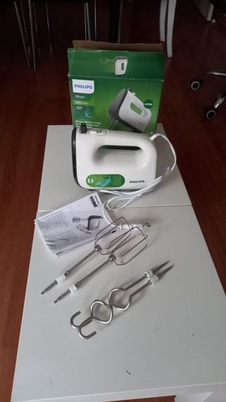 Batidora amasadora de la marca Philips, con una potencia de 450W. Incluye varillas para batir y amasadores... - Diseño ergonómico en color blanco y gris. - Accesorios de acero inoxidable. - Manual de instrucciones incluido.