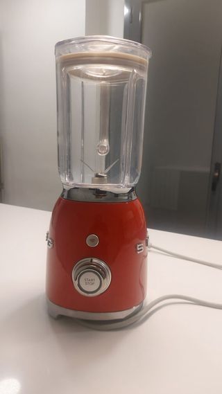 Batidora de vaso de la marca SMEG en color rojo del año 2020. Diseño retro y elegante. Fácil de montar y desmontar No disponemos de la caja de embalaje. *Se encuentra en perfecto estado, precio en web oficial 240€* - Cuerpo de aluminio. - Palanca de acero inoxidable. - Base antideslizante. - Jarra de plástico de capacidad 1.5L - Peso total 3.65Kg - Potencia 800W