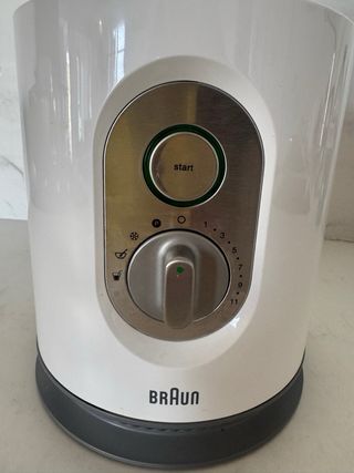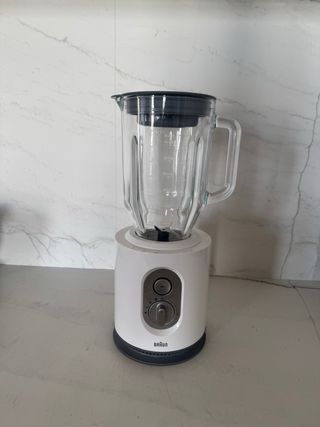 Batidora de vaso Braun con jarra de cristal Identity Collection. - Jarra de cristal con marcas de medición 1,6L. - Tapa con cierre hermético. - Base con controles. - Diseño moderno blanco. - Para recoger en Barcelona.