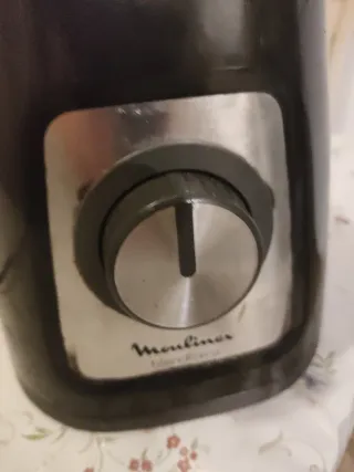 Batidora Moulinex con jarra de cristal. - Jarra de cristal con asa. - Tapa negra. - Base negra con panel de control plateado. - Selector de velocidad y botón clic. Capacidad 2 l. Con aspas dentadas para picar hielo.. Funciona perfecto... Jarra de vidrio. Su precio se debe que le falta el tapon transparente de arriba y una goma de las patas. No interfuere en su correcto funcionamiento.