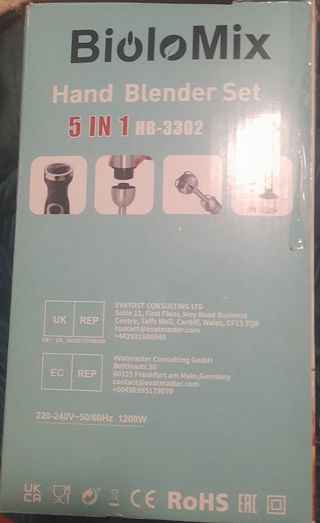 Batidora de mano BioloMix, modelo HB-3302, con múltiples funciones. - Diseño 5 en 1. - Potencia de 1200W. - Voltaje 220-240V, 50/60Hz. - Incluye accesorios. - Certificación CE y RoHS.