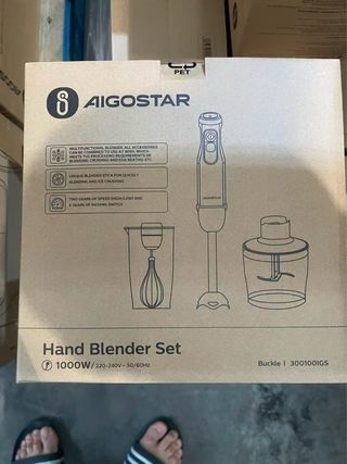 Batidora de mano Aigostar con múltiples accesorios. - Potencia de 1000W. - Dos velocidades (alta/baja) y 6 velocidades de pulso. - Incluye batidor y picador. esta Nuevo sin usar