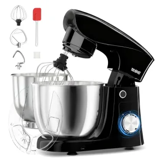 Batidora amasadora eléctrica de color negro, con una potencia de 1500W. Incluye varios accesorios para diferentes preparaciones. - Bol de acero inoxidable. - Varillas para batir. - Gancho amasador. - Varillas para mezclar. - Espátula de silicona. YASHE Batidora Amasadora 1500W, 4,5 + 5L Doble Bol de Acero Inoxidable, 10+P Velocidades, Movimiento Planetario, Cabezal Inclinable, Gancho para Masa, Batidor y Varillas. Tamaño: 13,5f. x 29,5an. x 36al. cm Capacidad : 9,5 Litros Peso Artículo 3,2 Kilogramos PvP 99 € Precio NO NEGOCIABLE PRECINTADO