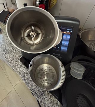 Cesta y vaso para batidora Mycook Touch. Están en buen estado. - Cesta de acero inoxidable con agujeros. - Vaso para batir, también de acero inoxidable.