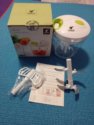 Práctica batidora y picadora THULOS, modelo 2 en 1. - Capacidad de 900 ml. - Incluye accesorios para picar y batir. - Diseño compacto y fácil de usar. - Regala artículos útiles. - Fabricada con materiales de alta calidad - Uso manual,sistema corredera.