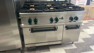 Cocina de 6 fuegos y horno marca Cica, con regulador de temperatura termoestático del horno de gran capacidad y armario lateral. Piloto de encendido y termopar de seguridad. Con dos quemadores de 8, dos de 6 y dos de 5 kw respectivamente. Cocina italiana de gran reconocimiento, quemadores desmotables para su fácil limpieza, horno con encendido eléctrico. Seminueva. Medidas 1.20 x 90 x 85 cm IMPUESTOS NO INCLUIDOS EN EL PRECIO. Esta revisada y comprobada por técnicos, tiene 3 meses de garantía. Puede visitarnos en Avenida Ronda número 69 de Baza - Granada. Teléfono y Whatsapp 642147036