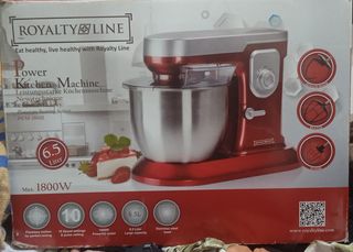Amasadora/batidora de cocina marca Royalty Line en color rojo. 1 solo uso (nueva) Cuenta con un bol de acero inoxidable de gran capacidad. - Capacidad del bol: 6.5 Litros - Potencia: 1800W - Acción de batido planetario - 10 velocidades y función pulse - Incluye gancho amasador, batidor y varillas