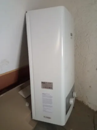 Calentador de agua de la marca Gils, modelo Bolonia. Un aparato de diseño blanco y frontal gris. - Dos mandos giratorios en la parte frontal. - Pequeño punto indicador en la parte superior.