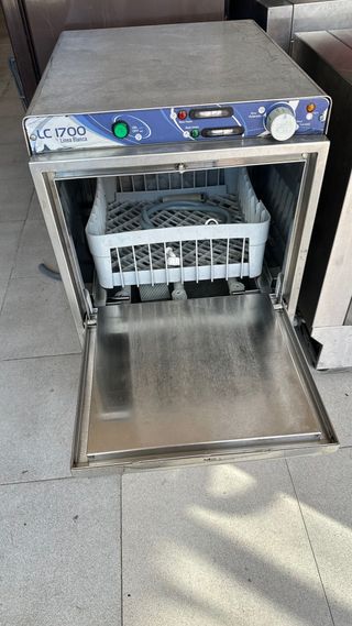 Lavavajillas profesional de la marca Línea Blanca, modelo LC 1700. Su diseño es de acero inoxidable. - Panel de control con indicadores luminosos. - Perilla de ajuste. - Puerta frontal de acero. - Base inferior metálica.