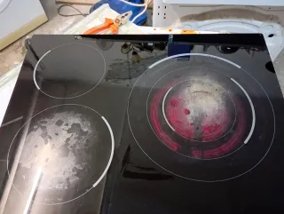 Cocina eléctrica con tres fogones. - Superficie de vitrocerámica negra. - Mandos frontales. - Indicador luminoso de encendido.