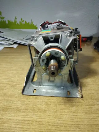 Motor de lavadora. - Componente eléctrico para electrodomésticos. - Montaje metálico. - Conexiones eléctricas visibles.