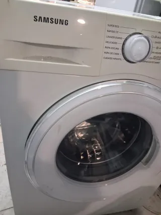 Lavadora de carga frontal Samsung en color blanco. - Programas: Super Eco, Rápido 15', Lavado Diario, Delicados, Ropa Oscura, Ropa de Cama, Cuidado Infantil. - Opciones: Algodón, Sintéticos, Ropa Vaquera, Aclarar, Centrifugar. - Tambor de gran capacidad.