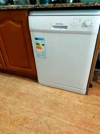 Lavavajillas de color blanco con panel de control superior. - Marca: ICECOOL. - Etiqueta energética visible.