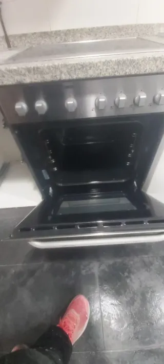 Cocina eléctrica de 60x60 cm con horno. - Encimera vitrocerámica con cuatro zonas de calor. - Mandos frontales para control de temperatura y funciones. - Horno con puerta de cristal y tirador.