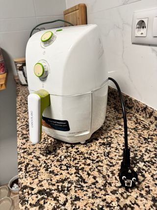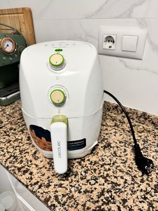 Freidora de aire Cecotec en color blanco. Cuenta con dos mandos giratorios para ajustar la temperatura y el tiempo. - Diseño compacto. - Asa extraíble para facilitar su uso. - Indicador luminoso de funcionamiento.