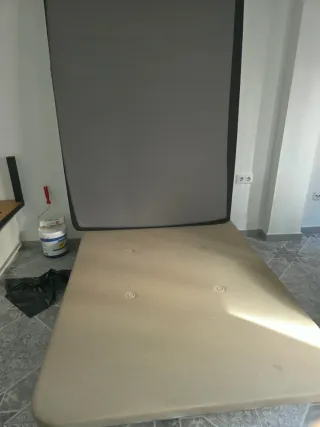 Base de cama individual en color beige. Se vende por cambio de mobiliario. - Tapizado en tela. - Diseño con botones. - Estructura firme. 100€ por todo lo que aparece en las fotos venir hoy cama plaza doble recojer en benidorm