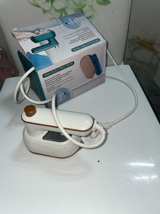 Plancha eléctrica compacta, ideal para viajes o retoques rápidos. Su diseño la hace fácil de manejar y almacenar. - Placa de panel de oro de porcelana EV. - Temperatura constante de 130°C. - Conducción de calor eficiente para eliminar arrugas sin dañar la ropa.