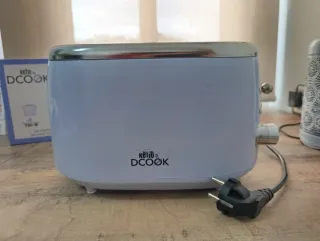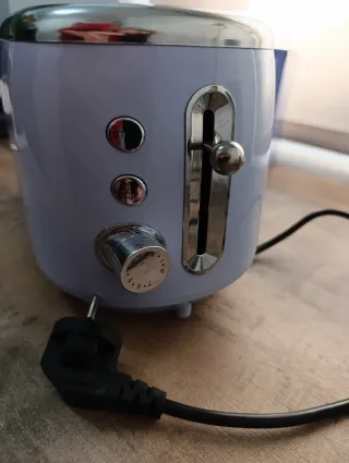 Tostador de pan con un diseño retro en color azul pastel. Acabado cromado en la parte superior. Potencia de 700 W. Lo compré para el trabajo y realmente no lo he estado usando. Funciona perfectamente.