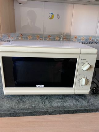 Microondas Svan en color blanco, perfecto para tu cocina. - Diseño compacto. - Panel de control intuitivo. -un poco amarillento por dentro -como se aprecia en la imagen -10kg