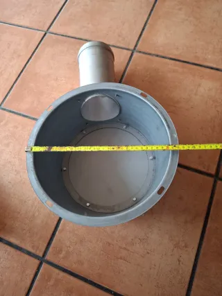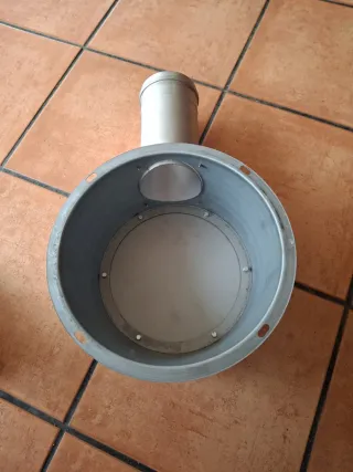 Caja de ventilación de forma redonda con un tubo de salida. Esta sin usar - Material metálico. - Diseño cilíndrico.