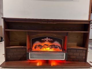 Chimenea decorativa con efecto de fuego. - Diseño elegante en madera oscura. - Incluye radiador eléctrico para calentar. - Estanterías laterales para almacenamiento.