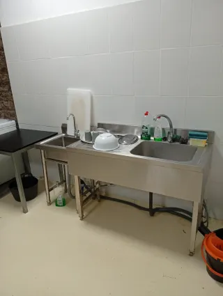 Conjunto de equipamiento profesional para cocina de hostelería. - Fabricado en acero inoxidable. - Incluye fregadero doble. - Superficie de trabajo adicional. - Accesorios de limpieza incluidos.