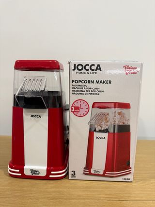 Máquina para hacer palomitas Jocca en color rojo y blanco. Ideal para disfrutar de un snack casero. - Diseño retro. - Fácil de usar. - Potencia: 1200W. - Incluye temporizador de 3 minutos. - Garantía de 3 años.