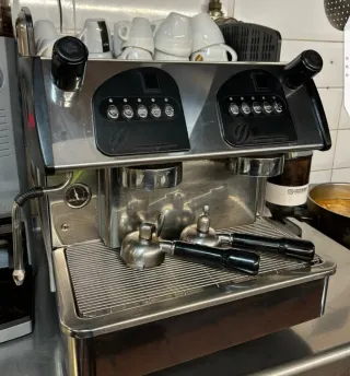 Cafetera Expobar ideal para tu negocio. - Diseño elegante en acero inoxidable. - Doble grupo. - Vaporizador. - Bandeja de goteo. - Portafiltros incluidos.