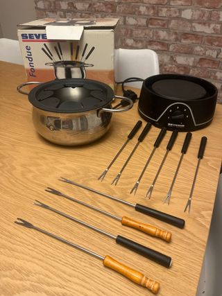 Set de fondue eléctrica de la marca Severin. Incluye el cazo, la base calefactora y 10 pinchos. - Cazo de acero inoxidable. - Base negra con control de temperatura. Comodísima de limpiar y facil para hacer fondue de carne y de queso.