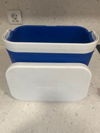 Nevera portátil de color azul y blanco con una capacidad de 8 litros. Cuenta con un asa blanca para facilitar su transporte. - Capacidad: 8L - Color: Azul y blanco - Asa de transporte plegable