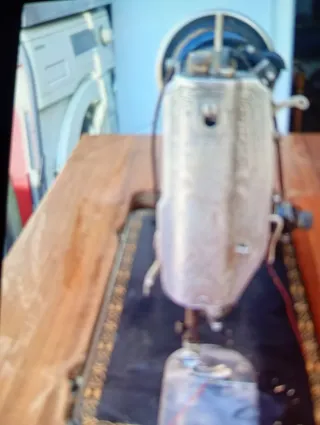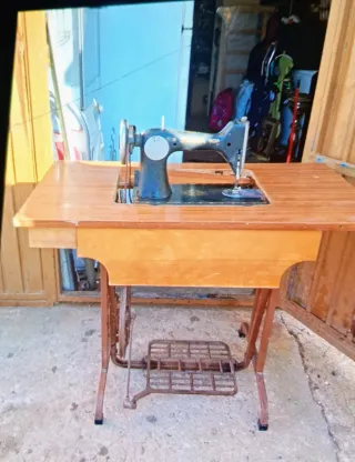 Máquina de coser antigua con su mueble y pedal. - Estructura de hierro forjado. - Tablero de madera. - Pedal para accionar la máquina.