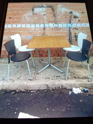 Conjunto de mesa y cuatro sillas para exterior. Ideal para terrazas o patios. - Mesa con sobre de madera y base metálica. - Dos sillas negras y dos blancas. - Patas metálicas.de ancho 80 de largo 80