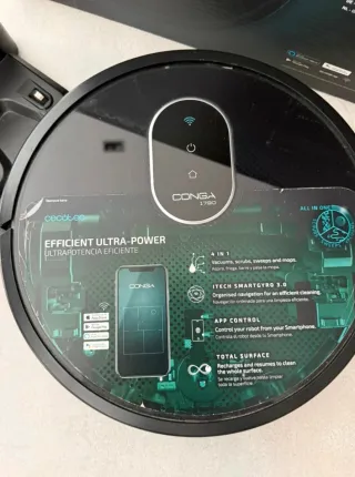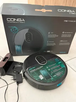 Robot aspirador Conga 1790 Titanium en color negro. Incluye base de carga y adaptador. - Tecnología iTech SmartGyro 3.0. - Función 4 en 1: barre, aspira, pasa la mopa y friega. - Control por App. - Total Surface para limpiar toda la superficie.