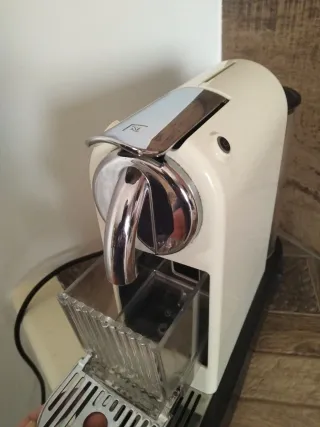 Cafetera Nespresso de color crema con detalles cromados. Un toque elegante para tu cocina. - Diseño compacto y moderno. - Bandeja recogegotas extraíble. - Depósito de agua transparente.