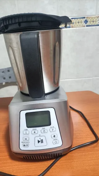 Usado únicamente 4 veces Trocea, pica, bate, a masa, fermenta Dispone de función turbo Pantalla digital Incluye 2 vaporeras, 1 cerstillo cocedor de huevos, 2 libros de recetas Jarra de acero inoxidable, 3,3 capacidad Motor superpotete con alta eficacia ya que evita pérdida de fuerza. Incluye una espátula. Y a mayores tiene unos adaptadores color rojo de protecion para no mojar el mecanismo donde va después al motor