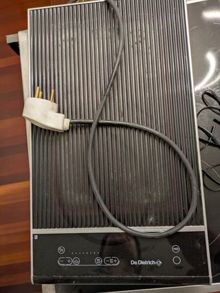 Placa De Dietrich gril eléctrico. Bien usado pero funciona muy bien. Perfecto para carne, pescado, sandwiches etc. Manual incluido. Altura 6cm; ancho 30cm; largo 51cm. Lo que entra la encimera 26cm; 49cm.