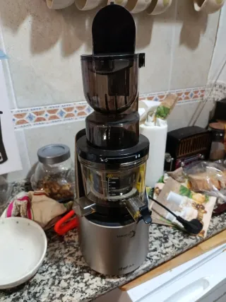 Exprimidor de alta gama Chef Plus, con un diseño moderno y funcional. - Cuerpo principal en acabado plateado. - Depósito superior transparente. - Boquilla de extracción de zumo.