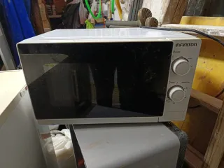 Microondas de sobremesa marca INFINITON en color blanco. Cuenta con dos mandos giratorios para ajustar la potencia y el tiempo. - Diseño compacto. - Mandos de fácil uso.