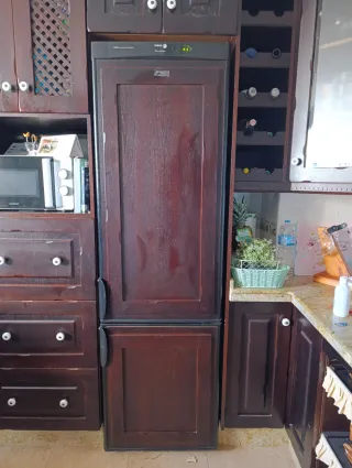 Frigorífico de la marca Fagor con un diseño clásico y elegante. - Puertas de madera oscura. - Panel de control superior.