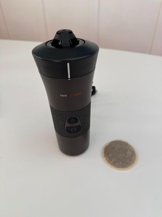Cafetera portátil Handpresso, ideal para usar en el coche con su conexión de 12V. Perfecta para disfrutar de un café allá donde vayas. - Diseño compacto y ergonómico. - Fácil de usar y limpiar. - Incluye un filtro para café molido.