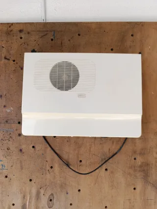 Secadora de ropa para uso doméstico. Diseñada para ser colgada en la pared. Pequeños signos de uso. - Color blanco. - Rejilla de ventilación circular. - Incluye cable de alimentación.
