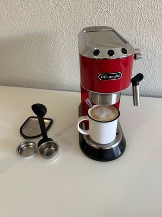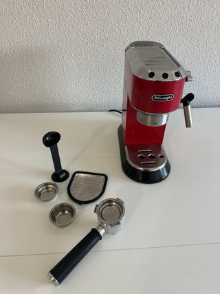 Cafetera espresso compacta de la marca DeLonghi, modelo Dedica. - Color rojo. - Incluye portafiltros, varilla para vaporizar leche, adaptadores para cafe y pieza de plastico para prensar. Usada pero sigue funcionando bien, Pequeño desperfecto en goma (no influye en funcionamiento) ultima foto Se vende por cambio a automatica.