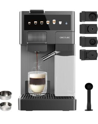 Cafetera de espresso automática Cecotec. - Diseño moderno en color gris. - Incluye depósito de leche. - Bandeja extraíble para facilitar la limpieza. - Para café molido y cápsulas