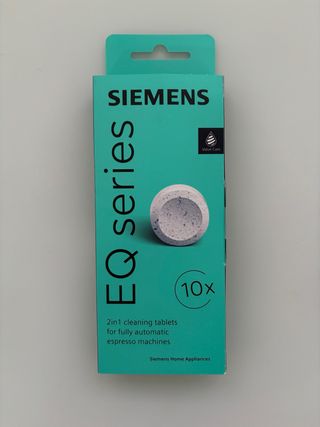 Caja de 10 pastillas de limpieza 2 en 1 para cafeteras automáticas Siemens EQ.series. Sin usar - Limpieza y cuidado para tu cafetera. - Diseñadas para máquinas de café automáticas. - Marca: Siemens Home Appliances.