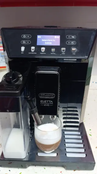 Cafetera superautomática DeLonghi Eletta Cappuccino EVO en color Negro y aluminio Prepara bebidas elaboradas a base de leche con solo pulsar un botón Prepara dos tazas de espresso a la vez Espuma de leche cremosa, densa y duradera a la temperatura perfecta con el sistema LatteCrema automático 6 bebidas con un solo toque y muchas otras recetas con el Menú de Bebidas Pantalla LCD con iconos de colores intuitivos Con uso ,pero cuidada, marcas de uso , últimas fotos, recién descalcificada,sin caja original e instrucciones en extranjero