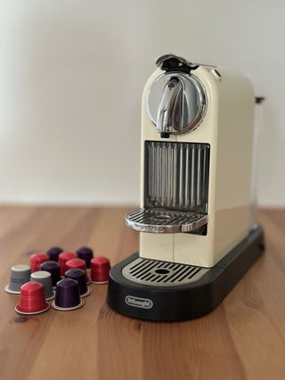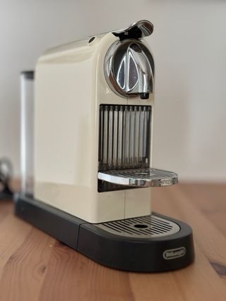 Cafetera Nespresso DeLonghi Citiz en buen estado. Ideal para preparar deliciosos cafés. - Diseño elegante en color crema. - Incluye cápsulas de café variadas.